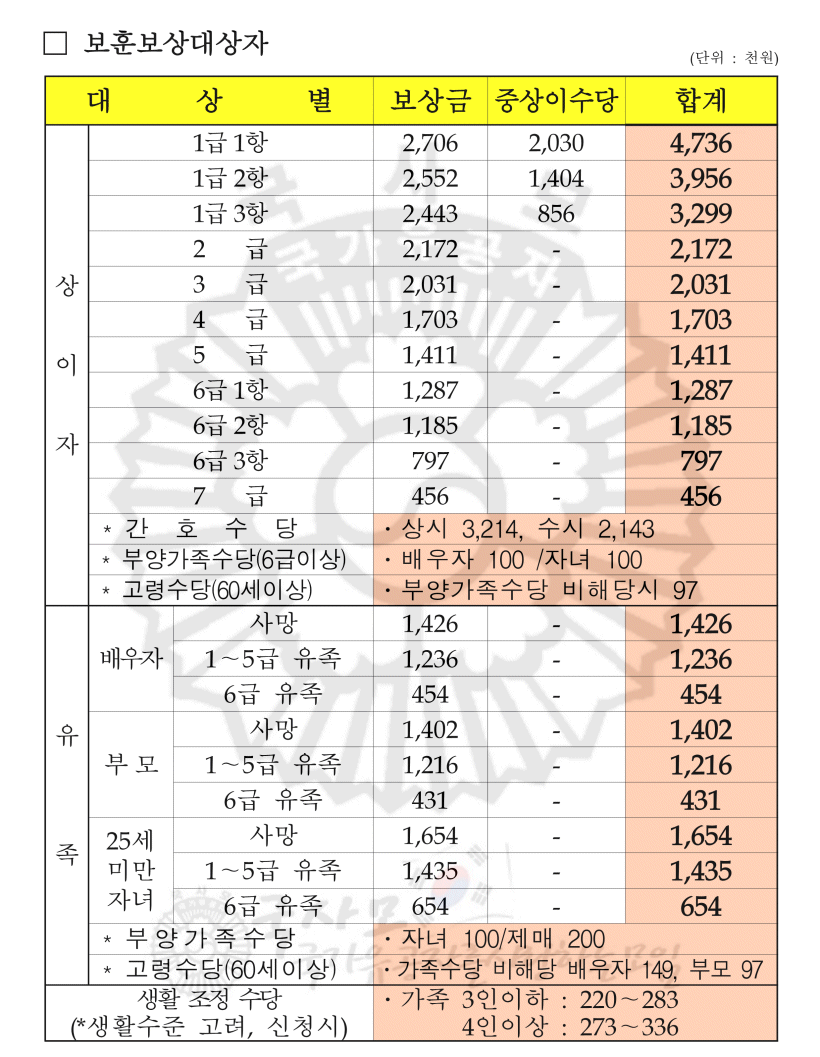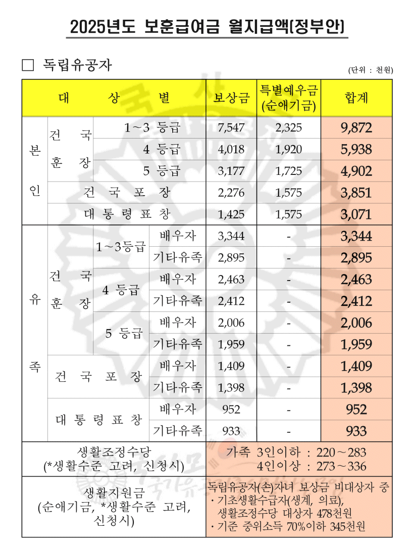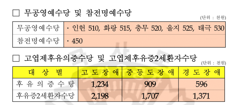 - 참전명예수당: 기존 월 42만 원에서 3만 원이 인상되어 월 45만 원이 지급될 예정입니다.