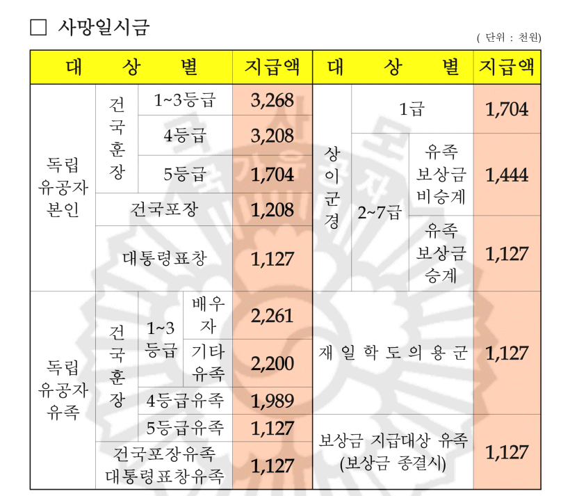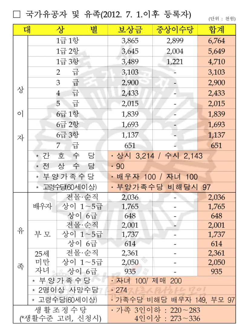 - 유공자 사망 후 배우자 또는 자녀가 승계 수급이 가능합니다.